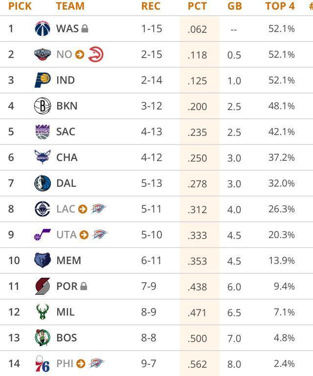 更让人脊背发凉的是下面这张图,如果今日开启NBA选秀乐透抽签,雷霆甚至可能收获三个明年的乐透签——分别来自快艇、爵士和76人。